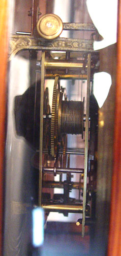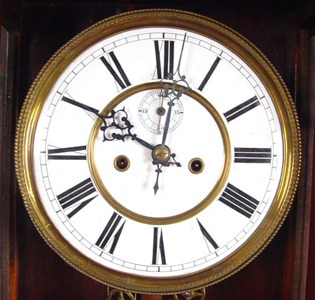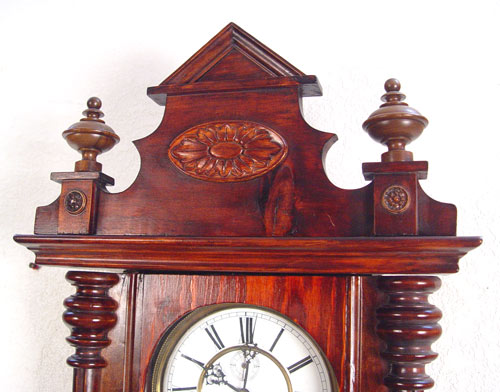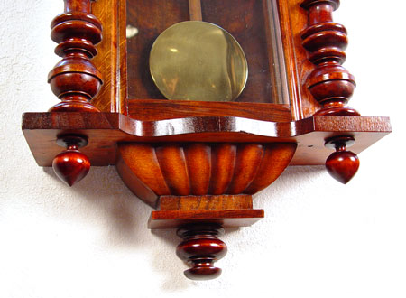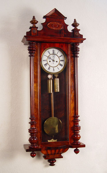 VIENNA WALL REGULATOR CLOCK: Refinished wood case with half columns on body and architectural pediment. 8'' face with second hand movement. Weight driven with pendulum. Measures 46 1/2'' high x 18'' wide x 7'' deep