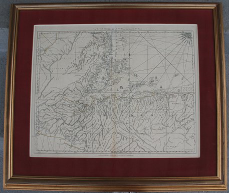1775 JEFFREYS' BRITISH MAP BAY OF HONDURAS: Charted by Thomas Jefferys, Geographer to his Majesty. Published by Sayer, London 1775. Nautical chart covering parts of Honduras, Belize, Guatemala, El Salvador, Nicaragua and islands of the West Indies. Note some foxing along fold lines. Sight size 19 3/4'' x 25 3/4'', framed and matted 28 1/2'' x 34 3/4''.