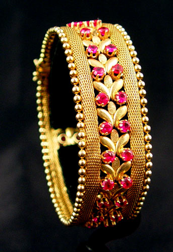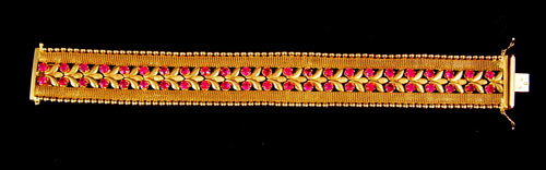 18K GOLD AND RUBY BRACELET: 18K yellow gold bracelet constructed of stylized fleur-de-lis, mesh and balls. 46 round shaped mixed cut synthetic rubies. The synthetic rubies are prong set. Weight: 54.8 grams. Length 7.5'' Width 7.5''. Unknown Hallmarks. No Reserve.