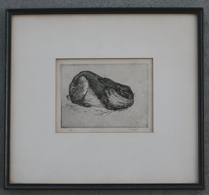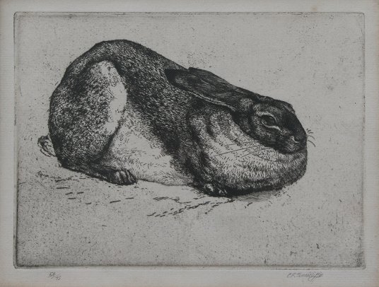 TUNNICLIFFE, Charles, (Britain, 1901-1979): Rabbit, Etching, full size with margins is 6 3/4'' x 8 1/4'', impression size is 5 1/2'' x 7 1/2'', pencil signed & numbered 56/75, framed, 15'' x 16 1/2''. Small tear in left margin and fleck of paper loss in upper right margin corner, mild toning.