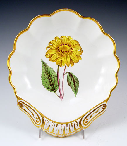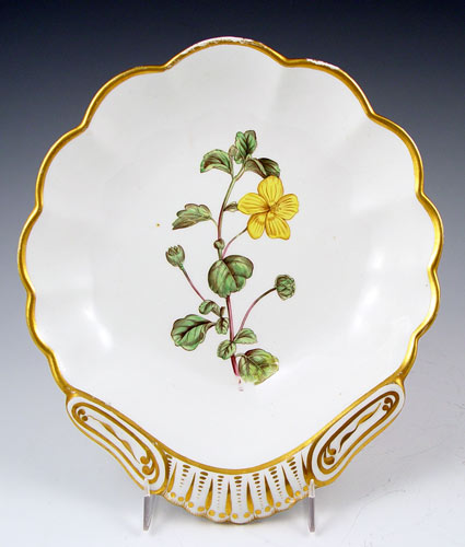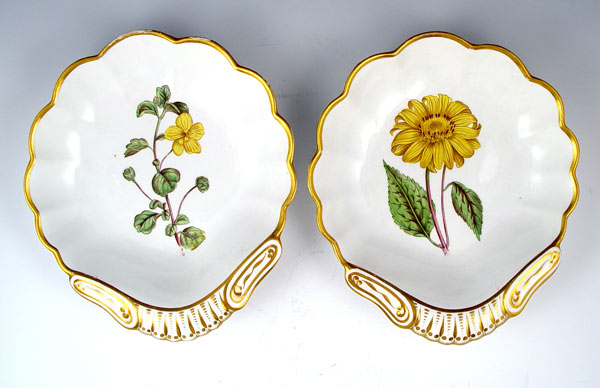 TWO 18TH SPODE BOTANICAL SHELL FORM DISHES: Hand painted Bitten- Leaved Hibiscus and Perennial SunFlowers. Wear to the gold rims. 9 1/4'' l. Spode mark indicates Ca. 1780-1790.
