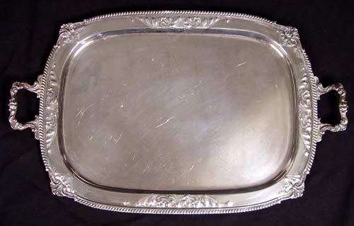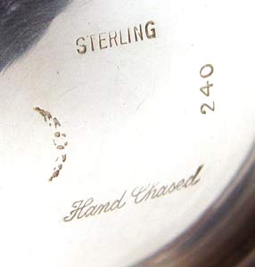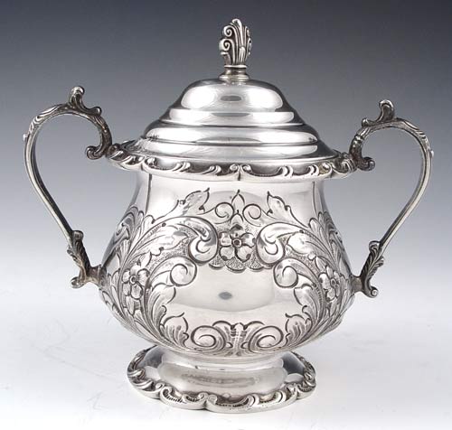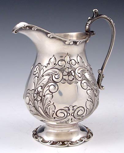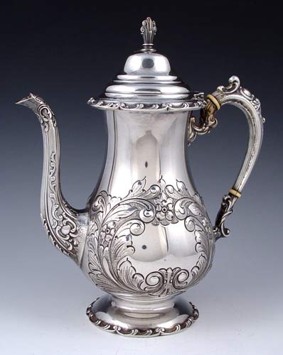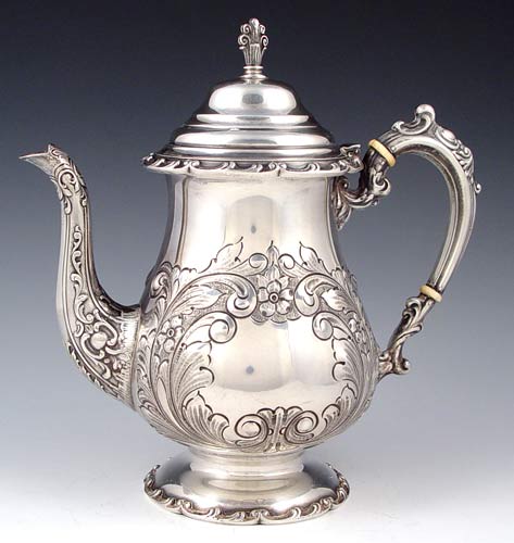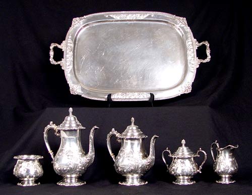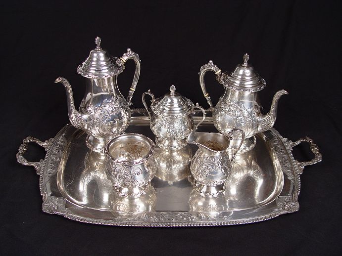 6 PIECE HAND CHASED STERLING TEA SERVICE: Unascribed American hallmark, hand chased with floral design. To include 1) Coffee pot with hinged lid, 2 ivory insulators on applied handle. Measures 11'' high. 2) Tea pot with hinged lid, 2 ivory insulators on applied handle. Measures 9 1/2'' high. 3) 2 handled covered sugar. Measures 6 1/4'' high to top of finial. 4) Open creamer 6 7/8'' high. 5) Waste bowl. 4'' high. 6) Matching 2 handled serving tray with hand chased rim, note scratches. Measures 28'' x 14 1/4''. Approx. 196.9 troy oz.