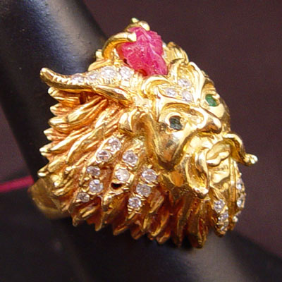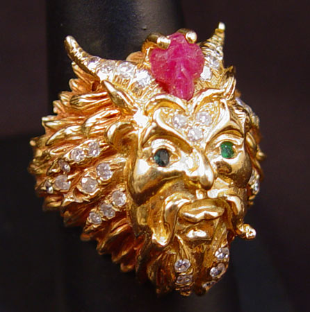 18K DIAMOND AND PINK SAPPHIRE FIGURAL RING: 18K yellow gold mythological figural ring with approx. .61 Ctw of diamond accents. A carved pink sapphire sits between the horns, approx. 1.25 Ct. Size 8. Weight 19.1 grams. No Reserve.