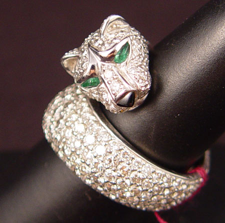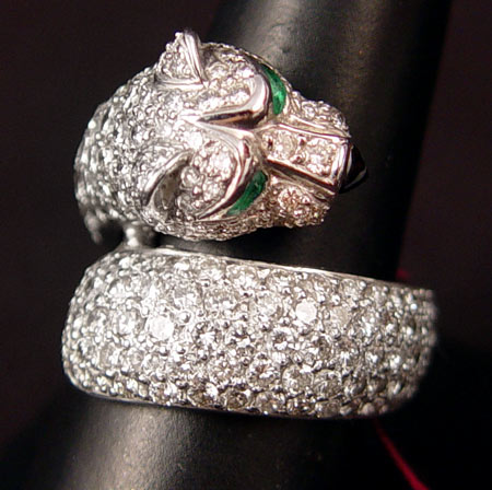 PLATINUM DIAMOND AND EMERALD CAT / TIGER WRAP RING: Platinum ring with approx. 5.00 Ctw. of pave' set diamonds, average VS in clarity and H-I in color. The eyes are 2 marquise shaped mixed cut emeralds, approx. .08 Ctw. The triangular piece of onyx forms the nose. Size 7.75. Weight 20.1 grams. No Reserve.
