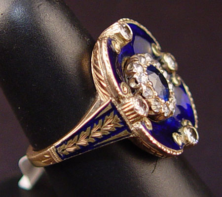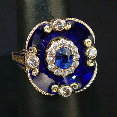 DIAMOND, SAPPHIRE AND ENAMEL RING: 14K yellow gold and enameled ring centering a 1 ct oval native cut sapphire, rated VS in clarity vB in hue 5 Tone and H-I color. Four round brilliant diamonds, approx. .33 Ctw., average I1 in clarity and I-J color. The sapphire and center diamonds are prong set, the brilliant diamonds are bezel set. A cobalt enamel cup surrounds the original ring center. A portion of the ring dates ca. 1900. The balance was constructed at a later date. A cobalt enamel cup surrounds the original ring center. Engraved gallery and shank with cobalt enamel. Size 6.5 Weight 10 grams. No Reserve.