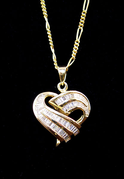 14K 1.00 CTW DIAMOND HEART PENDANT: 14K yellow gold stylized heart pendant with 61 straight and tapered baguette cut diamonds. Weight: 1.00 Ct. Approx. Rated SI-I1 in clarity and G-H in color. The diamonds are channel set. 18K 20'' yellow gold Figaro chain. Weight: 9.9 grams. Heart approx. 1'' in length. No reserve.