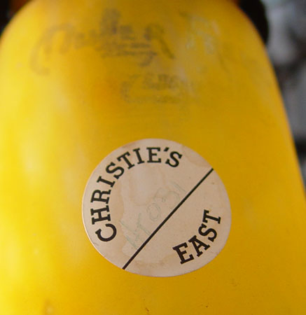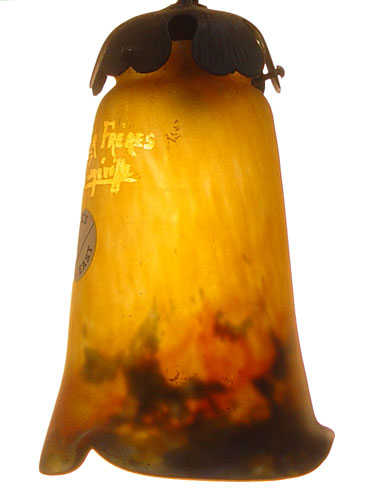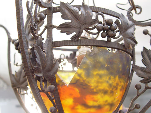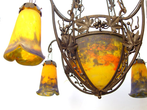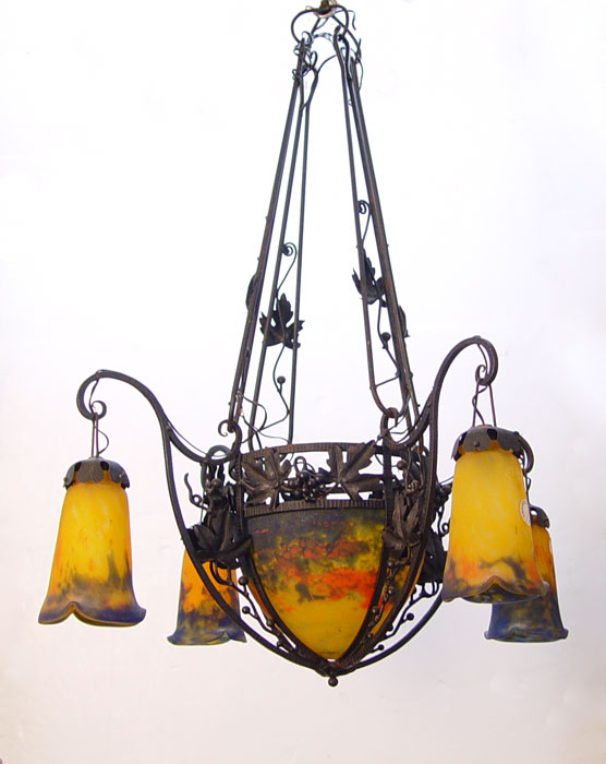 MULLER FRERES ART DECO CHANDELIER: Leaf and branches metal chandelier with orange, yellow and blue mottled glass shades. Circa early 20th century. Signed, with Christie's East paper tag. Please note piece missing from center globe. 30 1/4'' high x 26'' dia.