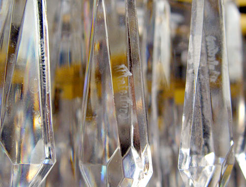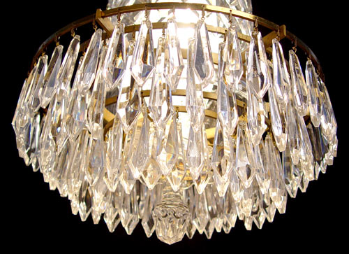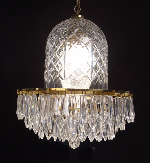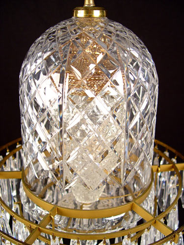 DIMINUTIVE WATERFORD CRYSTAL CHANDELIER: 4 tiers of drop prisms under a double tier of domed shades. The prisms are signed Waterford. The chandelier is 16'' high, approx. 15'' dia. The chain is 11'' long.