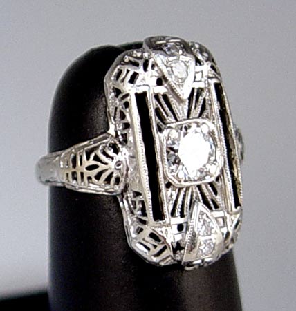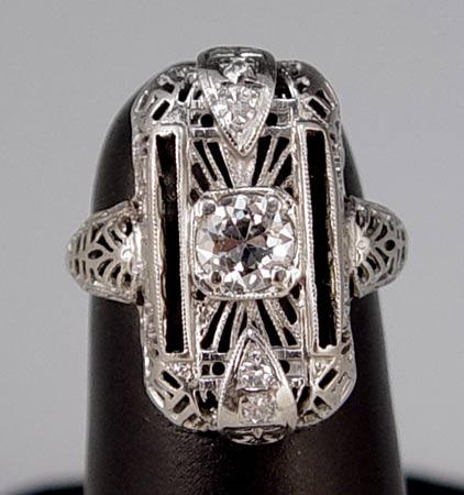 EDWARDIAN 18K & PLATINUM DIAMOND RING: 18K white gold and platinum filigree ring contains one transitional round brilliant cut diamond, approx. .40 Ct. Rated VS1 in clarity and H in color. Accented with 4 round single cut diamonds, approx. .06 Ctw. Rated VS in clarity and H in color. The diamonds are prong set. Weight: 3.3 grams. Size: 4 No Reserve.