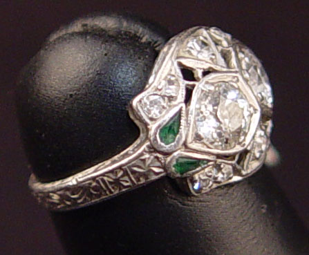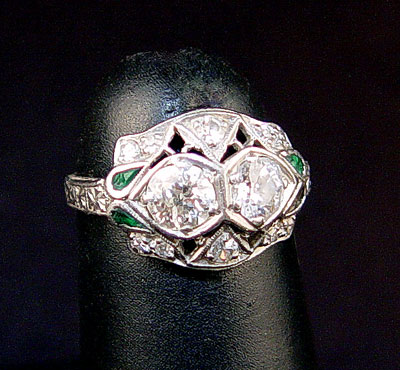 PERIOD DECO PLATINUM DIAMOND RING: Two old European round cut diamonds, approx. .63 Ctw., rated SI2-I1 clarity, H-I color. Note one diamond is chipped. Also 10 round single cut diamonds, Approx. .15 Ctw., Average VS clarity and H color. Diamonds are bead set. The 3 green stones are unknown origin, one is missing, 3 are cracked. (they can be removed to complete the filigree). Size 2.75. Weight 3.2 grams. No Reserve.