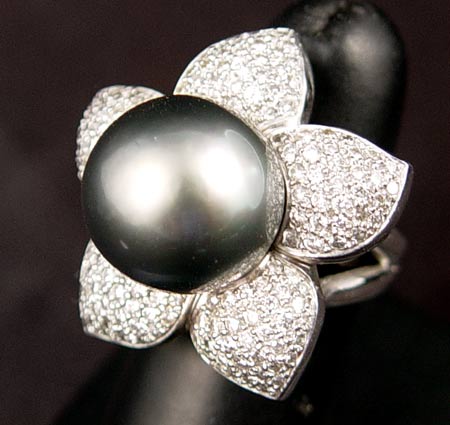 TAHITIAN BLACK CULTURED PEARL AND DIAMOND FLOWER FORM RING: 18K white gold ring featuring a 15 mm drop shape Tahitian cultured black pearl with a pink/green overtone with high luster. The petals contain 161 round brilliant cut diamonds, total approx. weight 2 Ct., average SI clarity, H-I color. The pearl is peg set, diamonds are pave' set. Weight 25.4 grams. No Reserve.