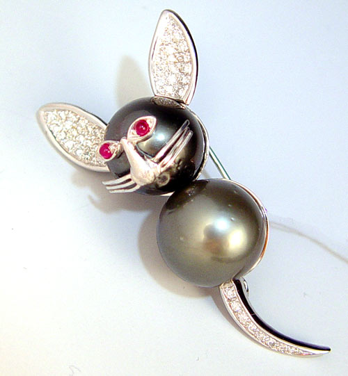 TAHITIAN BLACK PEARL FIGURAL MOUSE BROOCH: 18K white gold brooch containing 2 round Tahitian black pearls, 14.5-15.5 mm., medium - high luster, slight blemish. His ears and tail are set with 24 round brilliant cut diamonds, approx. .36 Ctw., average VS-SI in clarity and G_H color. The eyes are 2 cabochon rubies, .12 Ctw. The pearl is peg set, the diamonds are pave set. Weight 18.2 grams. 2 1.4'' tall. No Reserve.