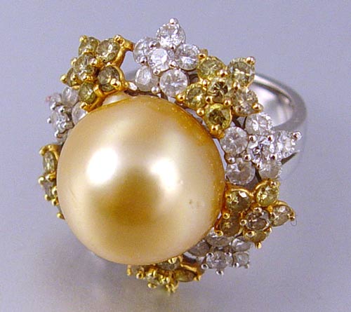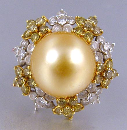 SOUTH SEA GOLDEN PEARL AND FANCY COLORED DIAMOND RING: 18k white gold ring with a 14.5 mm golden cultured pearl. Flower shaped cluster of diamonds circle the pearl. There are approx. 1.5 ct of 30 fancy yellow diamonds, average SI in clarity. Also 30 round brilliant diamonds, approx. total 1.5 Ct., average SI clarity, G-H color. Size 6.5. Weight 16.2 grams. No Reserve.