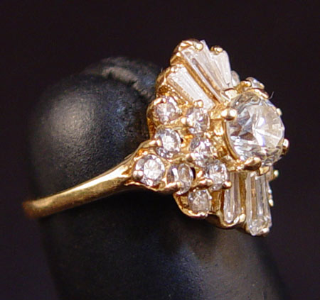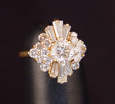18K DIAMOND ''BALLERINA'' RING: 18K yellow gold ring centering an approx. .66 Ct brilliant cut diamond, rated VS2 in clarity and J color. There are 14 round brilliant cut diamonds and 6 tapered baguette diamonds , approx. 1 Ctw., average VS clarity and H-I-J color. Prong set. Size 3, Weight 3.6 grams.