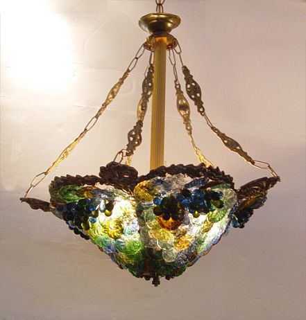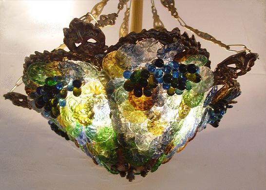 VENETIAN GLASS FLOWER & GRAPES CHANDELIER: Multi colored flowers & grapes attached to gilt metal and wire frame. 3 light sockets. Measures 19 1/2'' high x 17 3/4'' dia.