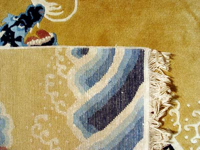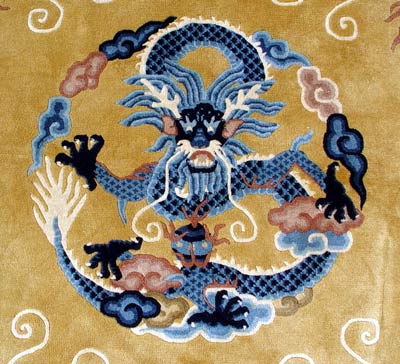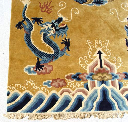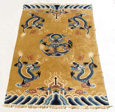 CHINESE DECO CARPET: Dragon motif on gold ground. Approx 8' x 5'.