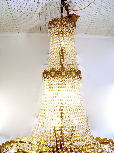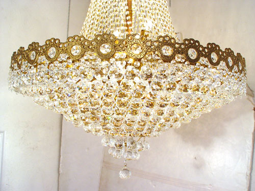 PALATIAL 4 FT TALL CRYSTAL CHANDELIER: Tiered rings of crystal. Age unknown. 18 lights, 36'' dia