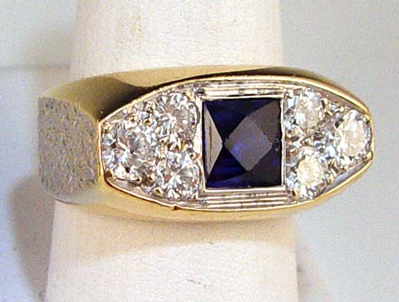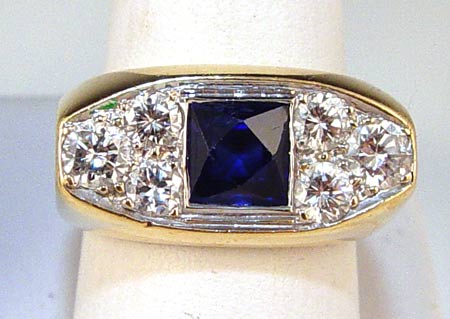 14K SAPPHIRE AND 1.75 CTW DIAMOND RING: 14K yellow gold ring contains a 6.50 x 6.50 mm square scissors cut synthetic sapphire and 6 round brilliant cut diamonds. Weight: 1.75 Ct. Approx. The diamonds average VS-SI in clarity and G-H in color. One diamond is chipped. The sapphire is bezel set. The diamonds are bead set. Weight: 15.5 grams. Size: 9 No Reserve.