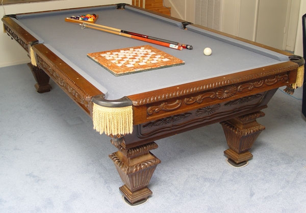 9 FOOT REGULATION BILLIARD POOL TABLE BRUNSWICK?: Good condition. Unmarked as to maker, possibly Brunswick. Comes with 2 sticks and balls. Viewing to take place at consignors home, please call for information.