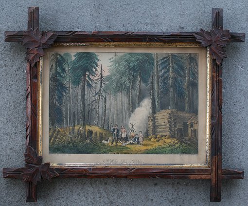 PERIOD CURRIER & IVES LITHOGRAPH ''AMONG THE PINES'': 10'' x 14'', original tree branch frame, 15'' x 20''. Some toning and mild staining.