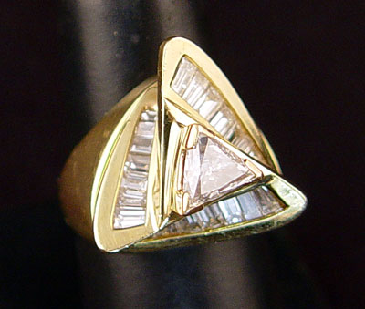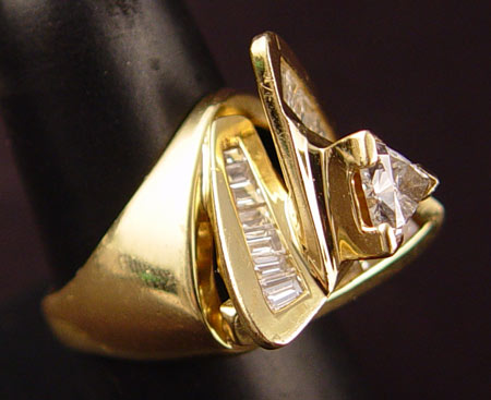 1 CT TRIANGLE BRILLIANT CUT DIAMOND RING: 14k yellow gold Space Age design ring featuring an approx. 1 Ct. triangle brilliant cut diamond, rated VS2 in clarity and G in color. 24 straight and tapered baguette cut diamonds fill in the Space Age look. Approx, 1.25 Ctw., average VS in clarity and G in color. Center diamond is prong set, small diamonds are channel set. Size 7.5. Weight 15.7 grams. No Reserve.