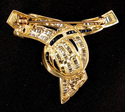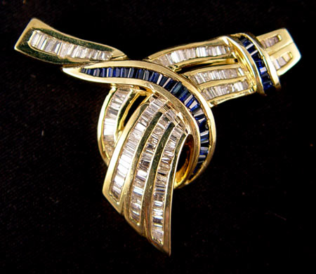 14K YELLOW GOLD BROOCH OF BAGUETTE CUT SAPPHIRES & DIAMONDS: 113 tapered baguette cut diamonds, approx. 2.00 Ctw. , SI-I1 in clarity and H-I color. 38 tapered baguette sapphires, approx. 1.00 Ctw., VS-SI, B hue, 6-7 tone and 3 in saturation. Diamonds and sapphires are channel set. Locking bar pin closure. 1 1/2'' l. Weight 12.1 grams. Sold with current Florida Diamond Appraisers GIA graduates appraisal for $3474. No Reserve.