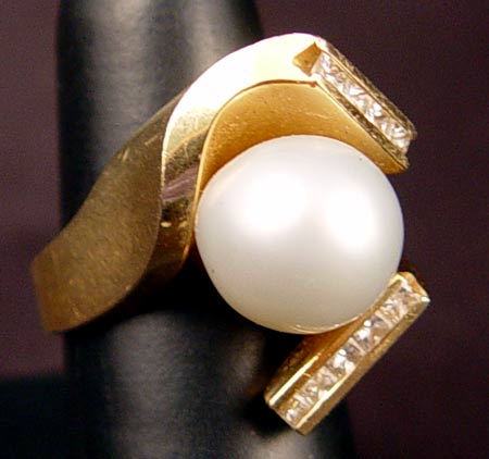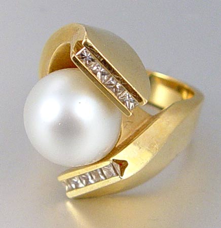 14K SOUTH SEA CULTURED PEARL RING WITH DIAMONDS: 14K yellow gold bypass style ring with 12.00 mm round shaped South Sea cultured pearl. White with pink overtone. Extremely slight blemish. High Luster. 9 princess cut diamonds. Weight: .90 Ct. Approx. Rated VS in clarity and G in color. Weight: 24.2 grams. Size: 7 No Reserve.