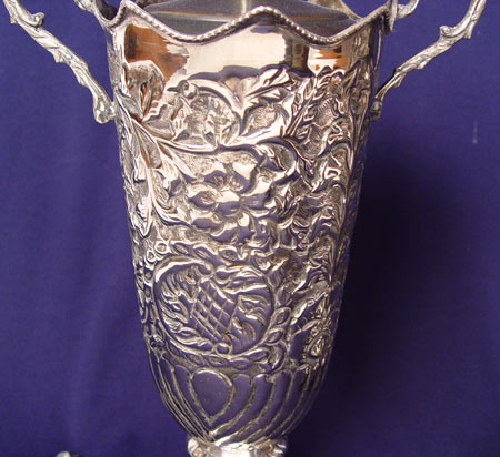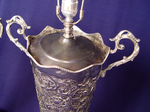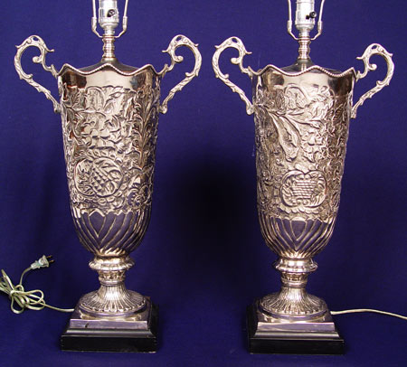 DECORATIVE EMBOSSED METAL TABLE LAMPS: Matched pair of embossed silver metal lamps, black base, silver color finial. 37'' h. overall.
