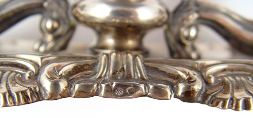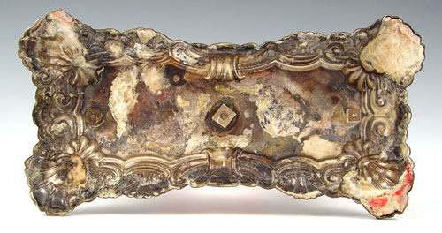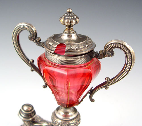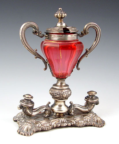 AUSTRIAN FINE SILVER MOUNTED CRANBERRY GLASS INKWELL: Circa 19th century 13th loth (812/1000) silver hallmark, unknown maker base, handles and hinged lid with cranberry glass body. Traces of gold paint decoration lines remain on body. Please note lid does not close all the way, body is has some looseness. Measures 7 3/4'' high x 6 1/4'' wide.