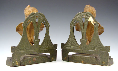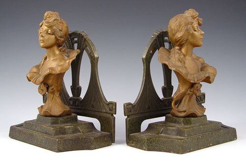 PAIR OF CAST IRON ART NOUVEAU FIGURAL BOOKENDS: Cold painted metal busts on a patinated iron stepped base and back drop. 8''h. No makers marks, though numbered 9754.