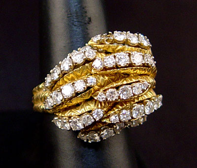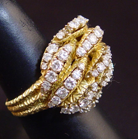 18K DIAMOND HIGH PROFILE COCKTAIL RING: Contains round brilliant cut and single cut diamonds, approx. 2.15 Ctw., average VS1 clarity and G-H color. Note one diamond has a small chip, one is missing. Size 8. Weight 16.2 grams. No Reserve
