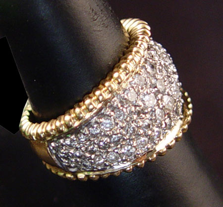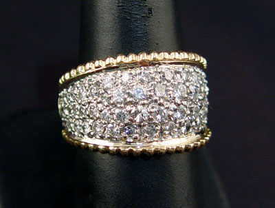 14K DIAMOND CLUSTER WEDDING BAND / RIGHT HAND RING: 14k yellow gold wide band holding 58 round brilliant diamonds, approx. 1.5 Ctw., average SI1-SI2 in clarity and H-I color. The diamonds are pave' set. Size 7. Weight 9.1 grams. No reserve.