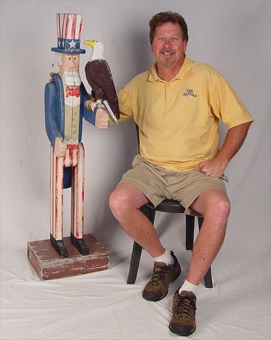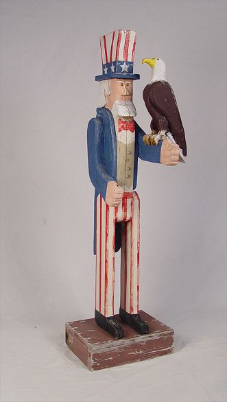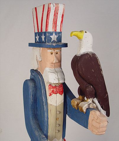 UNCLE SAM FOLK ART CARVING: Uncle Sam figure standing on bow with eagle on arm. Eagle is removable. Measures 52 3/4'' high x 15'' x 18 1/2''.