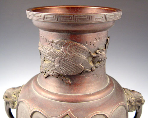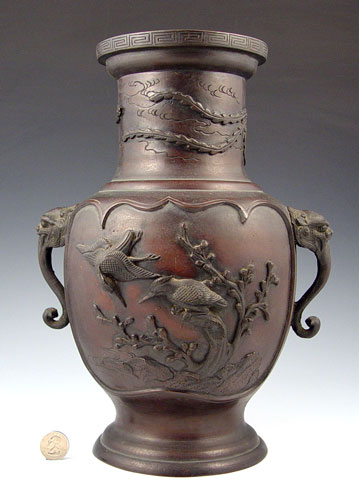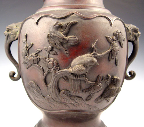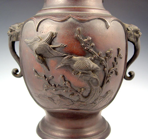 BRONZE ORIENTAL VASE: Raised images of birds on branches, flying bird around neck. Figural lion head handles. Signed on base in characters. Measures 13 1/8'' high x 10'' wide at handles.