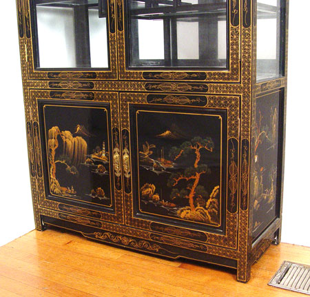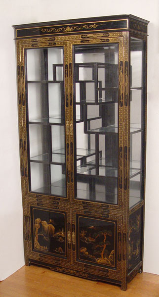 CHINOISERIE CURIO CABINET: 8 multi level and size glass shelves in upper cabinet over 2 doors. Measures 76 1/8'' high x 36'' wide x 14'' deep.