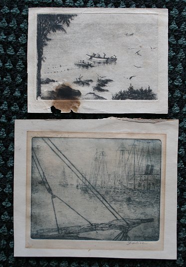 CLEMENT(S), Gabrielle, (American, 1858-1948): Hauling in the Nets, Etching, 6'' x 8 1/4'', pencil signed, stained and sold as is, & DOLICE, Leon, (American, 1892-1960): Dockside Scene, Etching, 8: x 9 1/2'', pencil signed, signed in the plate and dated 1922, glue residue verso. Sold as is.