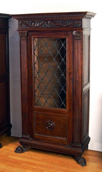 CARVED MAHOGANY SIDE CABINET WITH LION FEET: Perfectly suited for an elegant wine cabinet. Tiered and molded crest over relief carved frieze. Single door with iron lattice. Columnar stiles, massive paw feet on front. Shelves will need to be replaced. Measures 5 ' 10'' high x 36'' wide x 19 1/2'' deep.