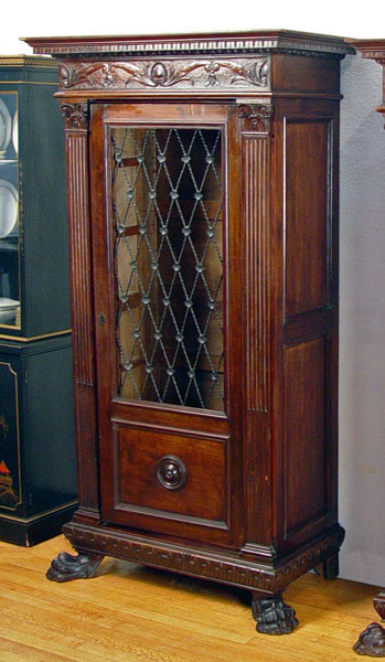 CARVED MAHOGANY SIDE CABINET WITH LION FEET: Perfectly suited for an elegant wine cabinet. Tiered and molded crest over relief carved frieze. Single door with iron lattice. Columnar stiles, massive paw feet on front. Shelves will need to be replaced. Measures 5 ' 11'' high x 36'' wide x 19 1/2'' deep.