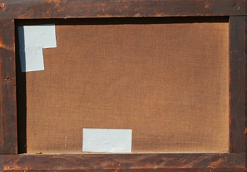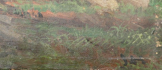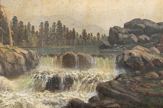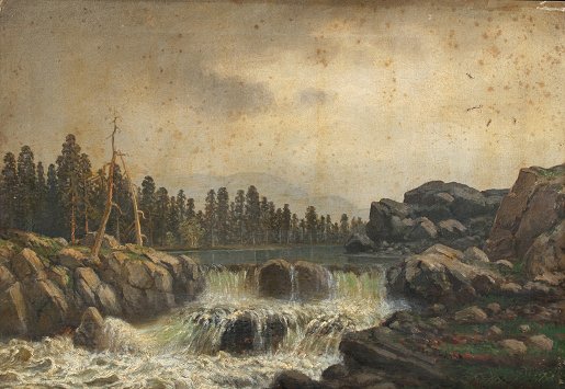 AMERICAN SCHOOL RIVER RAPIDS SCENE: Oil/Canvas, 14'' x 20'', signed J.H.?, encased in worn period gilt deep dish frame with overpaint, 23'' x 29''. Several tears and abrasions, patches visible verso, spotting from mold? in the sky.