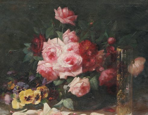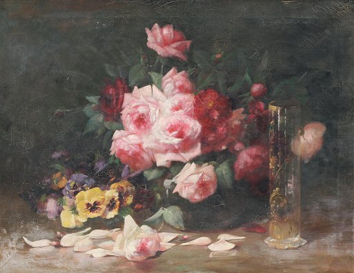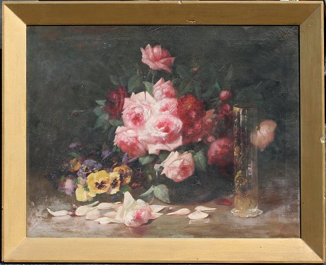 FENETTI, Frederick M., (American, 1854-1915): Floral Still Life with Roses and Enameled Glass Vase, Oil/C, 23'' x 30'', signed, framed, 27 1/2'' x 34 1/2''. Cracklure, needs cleaning, several pinpoint flecks.