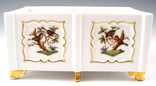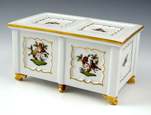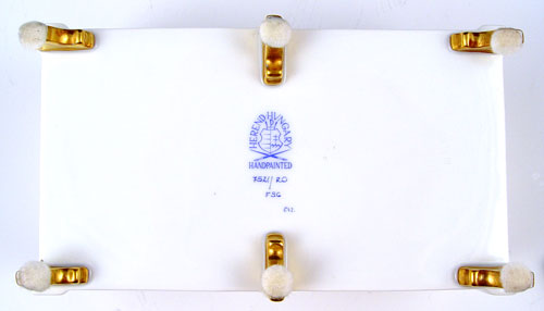 HEREND PORCELAIN COVERED BOX: Bird, fly and butterfly decoration. Measures 3 1/2'' high x 6 1/2'' x 3 3/4''