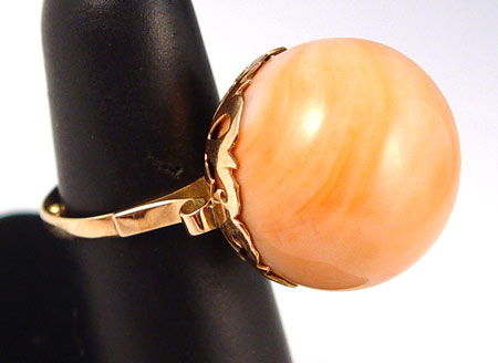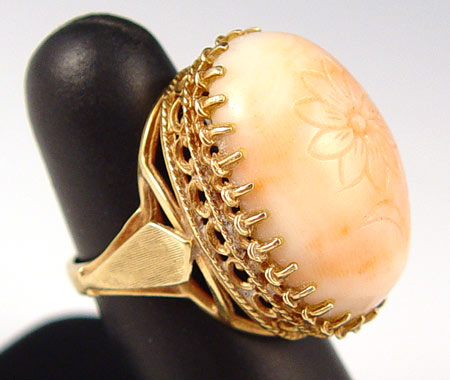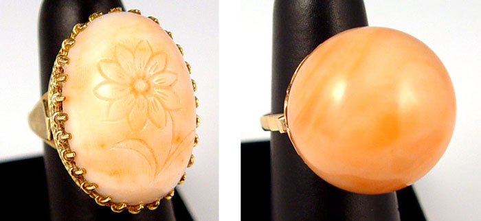 2 CORAL RINGS: 1) Ca. 1940's 18K rose gold ring with one round brad cut piece of angel skin coral. Moderate mottling. Fancy cut-out gallery. Weight: 15.9 grams. Size 6. 2) 14K yellow gold ring with one oval cabochon cut piece of angel skin coral. Slight mottling. A carved stylized flower in top of cabochon. Fancy filigree gallery. Weight: 13.0 grams. Size: 6.25 No Reserve.
