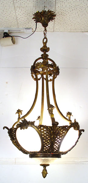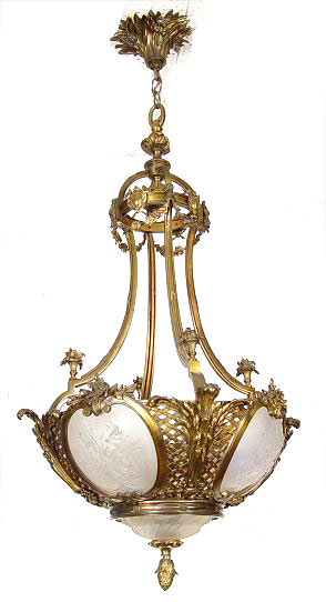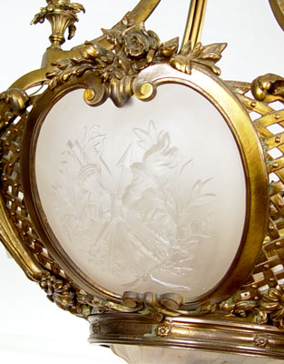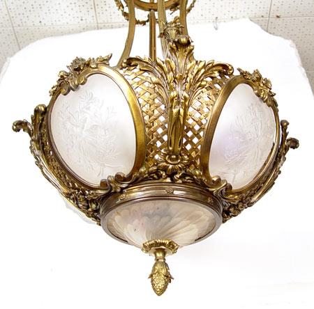 GLASS PANEL CHANDELIER: Decorative gilt metal chandelier with scenic embossed glass panels. Hangs approx. 40'', 17'' dia.
