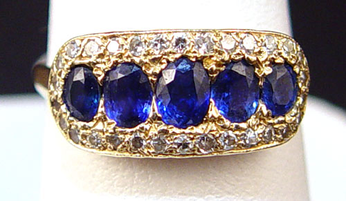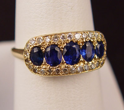 14K DIAMOND AND 5 SAPPHIRE RING: 14K yellow gold ring with 30 round single cut diamonds. Rated VS in clarity and H-I in color. 5 oval mixed cut sapphires, weight: 1.00 Ct. Approx. Rated VS in clarity (type II) vB in hue, 6 in Tone and 3 in Saturation. The sapphires and diamonds are prong set. Weight: 2.8 grams. Size: 7.5 No reserve.