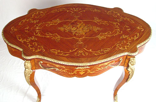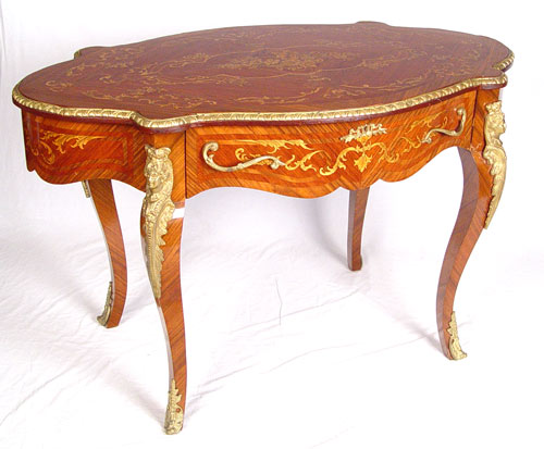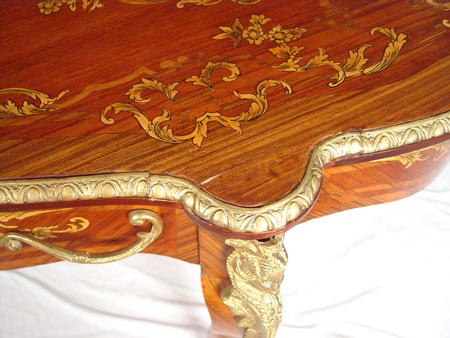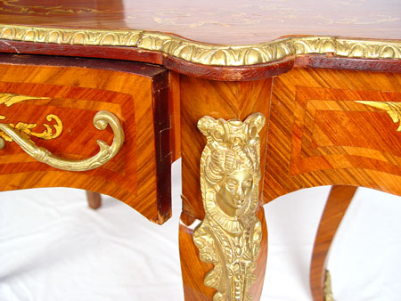 FRENCH NAPOLEONIC STYLE DESK: Single drawer, marquetry floral inlay with ormolu figural head decoration on leg. Measures 32'' high x 51 1/2'' wide x 31'' deep.
