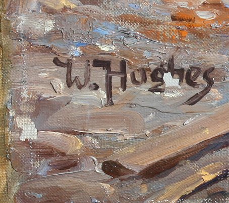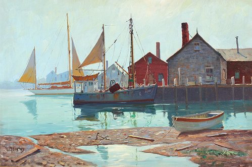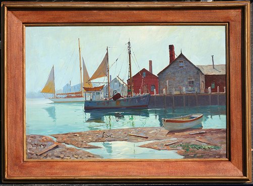 HUGHES, William, (American, 20th C): Gloucester Harbor, Oil/C, 24'' x 36'', signed, framed, 30'' x 42''. Several flakes near signature.