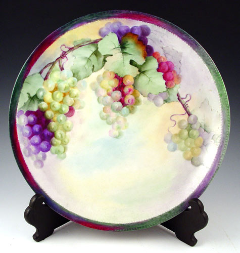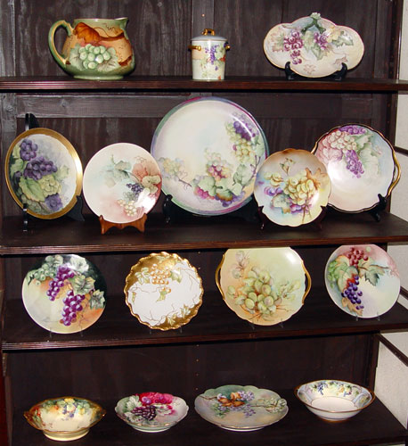 16 PIECE COLLECTION OF HAND PAINTED GRAPE DECORATED FRENCH LIMOGES: To include 1) Guerin & Co. lemonade pitcher, 6 1/2'' high x 9 7/8'' wide at handle. 2) Tressemanes & Vogt covered jar, 5 1/2'' high. 3) Jean Pouyat plate, 8 3/8'' dia. 4) Bernardaud & Co. plate signed M.L.R. 1912, 10'' dia. 5) Guerin & Co. handled condiment dish, 10 3/4'' x 6 1/2''. 6) Haviland charger, 13''. 7) signed G. Bruner? 1903 plate, 8 1/2''. 8) Tressemanes & Vogt signed N. Lovett 2 handle serving plate, 11'' dia. 9) La Seynie P & P charger, 11 1/2'' 10) Delinieres & Co. plate, 9''. 11) Jean Pouyat plate, 9''. 12) Signed Manley? bowl, 8 7/8'' dia. 13) ? bowl, 9 1/2'' 14) Lobo Flambeau signed Gille, 8 1/2''. 15) Tressemans & Vogt 2 handle plate, 10 7/8'' dia. 16) Haviland signed E. Gabel 2 handle bowl, 10 7/8''.