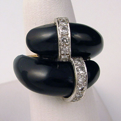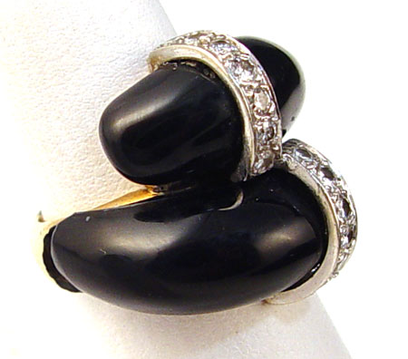 14K ONYX AND CTW DIAMOND RING: 14K yellow gold ring with 2 curved contoured pieces of black onyx approx. 25.00 x 9.00 mm. 14 round brilliant cut diamonds. Weight: .50 Ct. Approx. Rated VS in clarity and G-H in color. The diamonds are bead set on curved 14K white gold trim. The onyx is glue set. By-pass design with high profile. Weight: 13.6 grams. Size: 7. No reserve.