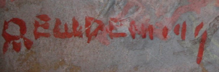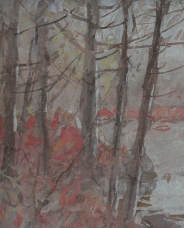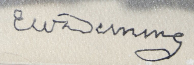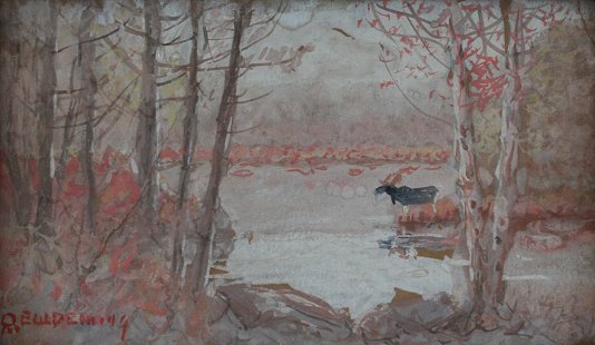 DEMING, Edmund Willard, (American, 1860-1942): Landscape with Moose, Gouache & W/C, 4'' x 6 1/2'', signed, sold with and autographed picture of Deming and unknown man Jackson?. Note art has crease with partial tear in board.