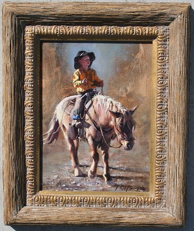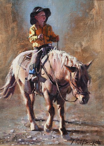 BECK, Phil, (American, 1949-): Boy on Horse, OIL/B, 12'' x 9'', signed and dated '74?, Classic Frameworks framing, 17'' x 14''.